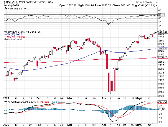 Caravan. It is important to note that the U.S. stock market is not alone in its advance to the upside, as many of its friends across capital markets have already been turning it up. Leading among the group is developed international stocks as measured by the MSCI EAFE Index, which had been trading at all-time highs as recently as the middle of March before its own correction but has already delivered on the symmetry discussed above – the peak-to-trough correction took roughly three weeks through early April and the subsequently trough-back-to-peak rebound to new all-time highs played out over the three weeks after.