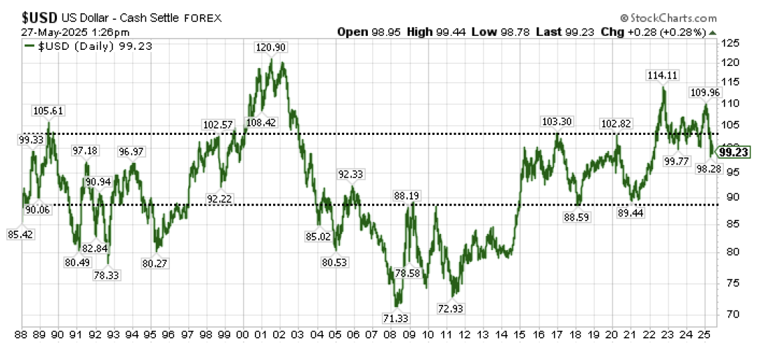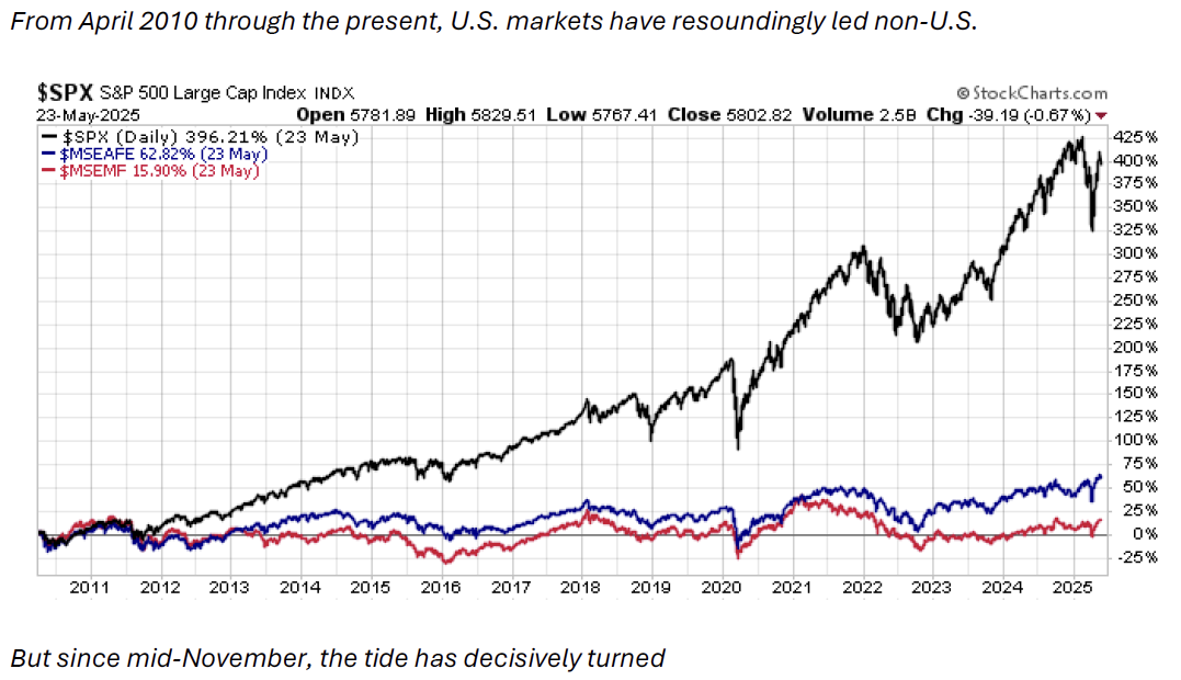 OK, but what might be the catalyst to not only potentially drive sustained U.S. dollar weakness relative to global currencies going forward but also provide justifiable fundamental support beyond simply valuations for non-U.S. stocks to start meaningfully outperforming the U.S. for a sustained period?