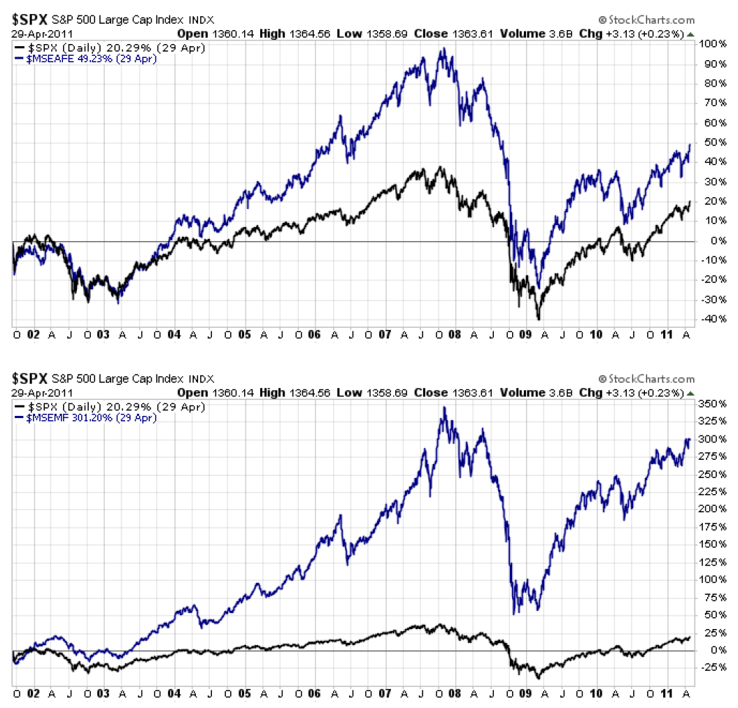 But just because investors have been thriving in U.S. markets for more than a decade does not mean that prior heroic returns from far-ranging markets around the world can simply be ignored.  For example, consider the prior period from 2000 through early 2011 when both developed international and emerging markets trounced the U.S. for more than a decade.